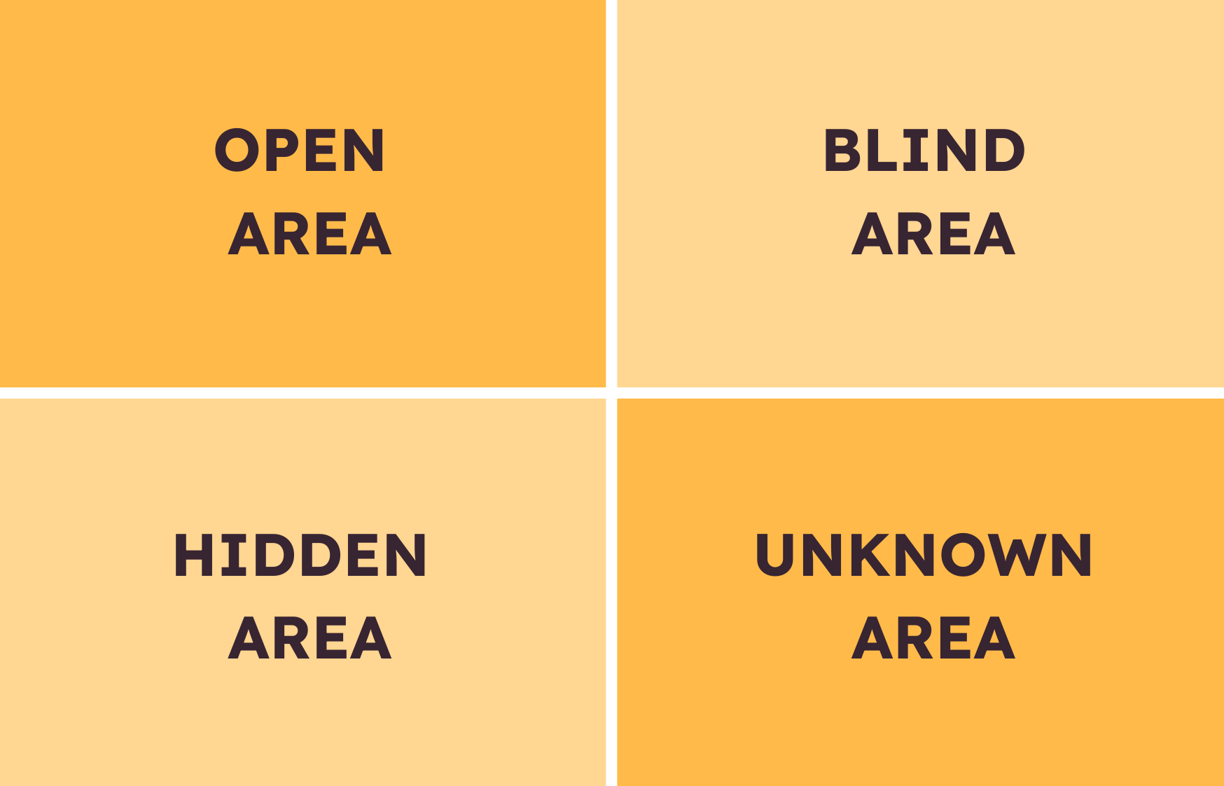 The Blind Area: What is unknown to you but known to others. You are unaware of some of your actions and feelings, while others perceive and know how you react.